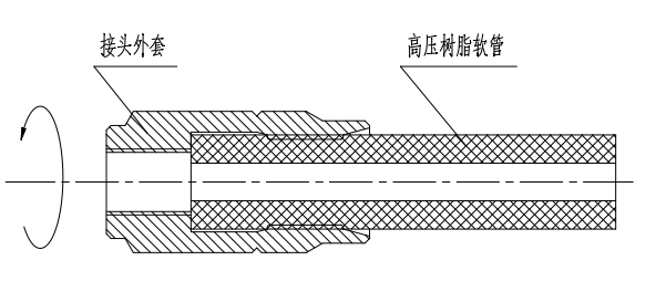 1) 將接頭外套逆時針方向旋轉(zhuǎn),套在軟管上,并盡力旋到底。為便于安裝,可先在接頭外套內(nèi)螺紋或軟管表面涂抹一層油或脂。