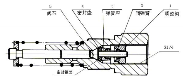 1,依次取出調(diào)整座 1、閥彈簧 2、彈簧座 3、密封墊 4、閥芯 5 等零件,用布擦去閥芯