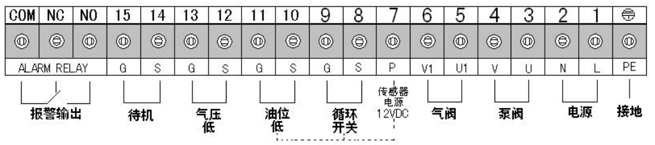 端子 12、13 接低氣壓信號(hào)檢測(cè)開(kāi)關(guān)(此開(kāi)關(guān)閉合控制器報(bào)警)。