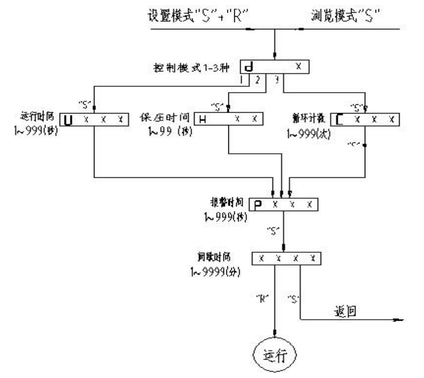 控制器處于任何狀態(tài)下按動(dòng)“S”鍵即可瀏覽已存貯的各項(xiàng)參數(shù),不影響當(dāng)時(shí)狀態(tài)。停止按鍵片刻即自動(dòng)返回。