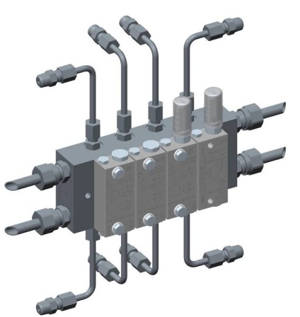 向 4 個(gè)或 8 個(gè)潤(rùn)滑點(diǎn)供油,每組的2個(gè)出油道通過(guò)基塊從2個(gè)出油口流出,或者二個(gè)出